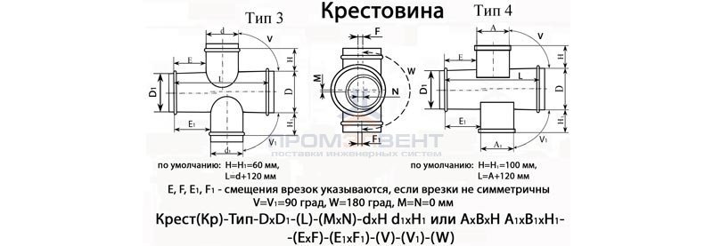 Крестовина представляет собой прямой участок воздуховода и врезанные в него врезки, количество врезок и сечение может быть различным. Крестовина круглого сечения может быть с прямоугольными врезками, с круглыми или в комбинации с прямоугольными и круглыми врезками. Врезки в крестовине могут быть расположены под различным углом.